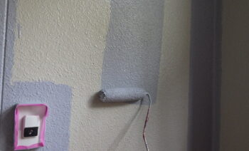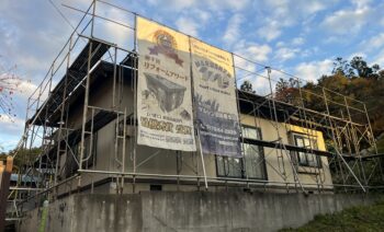 青森県十和田市の「全面改装工事」で外壁部の上塗施工中です!