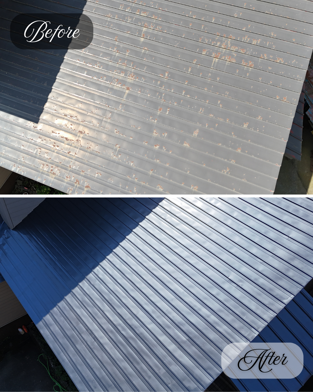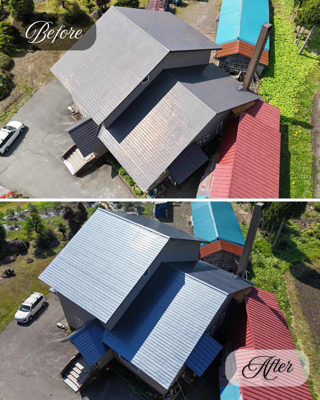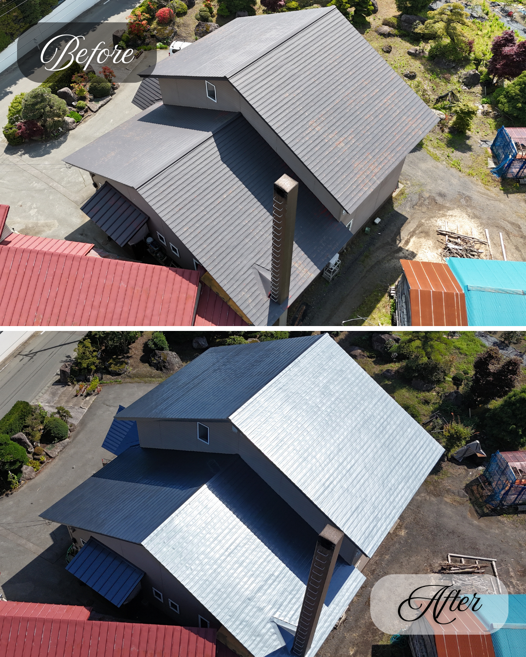 錆の発生や旧塗膜のハガレが全体的に見受けられた屋根が、きれいによみがえりました。