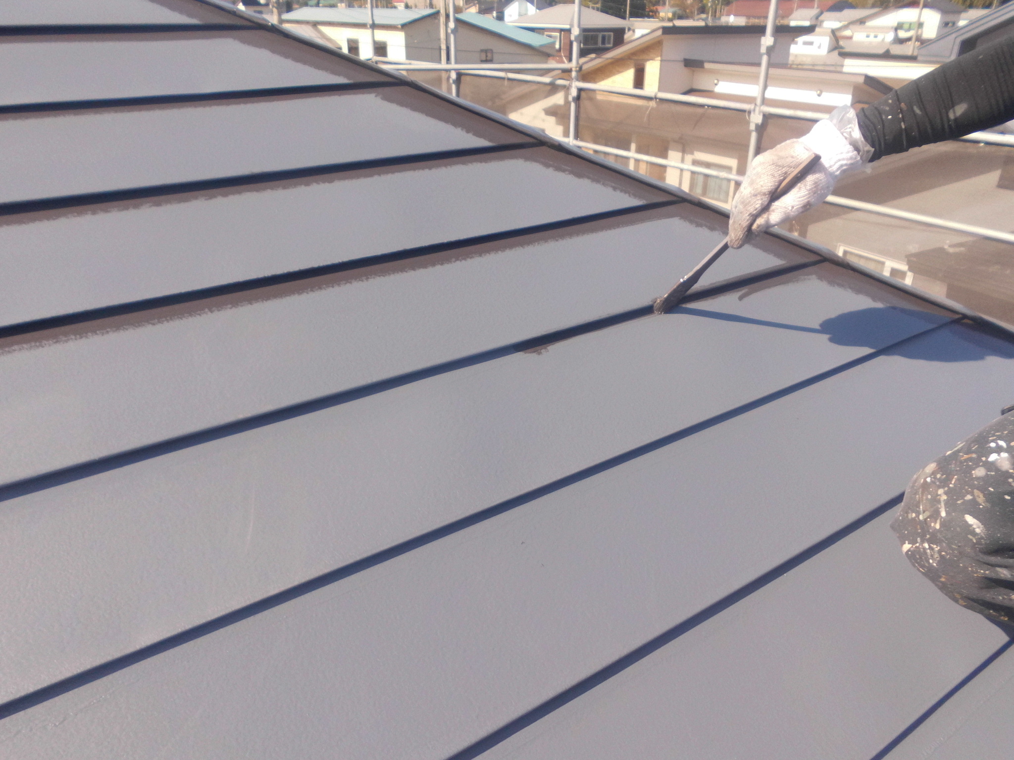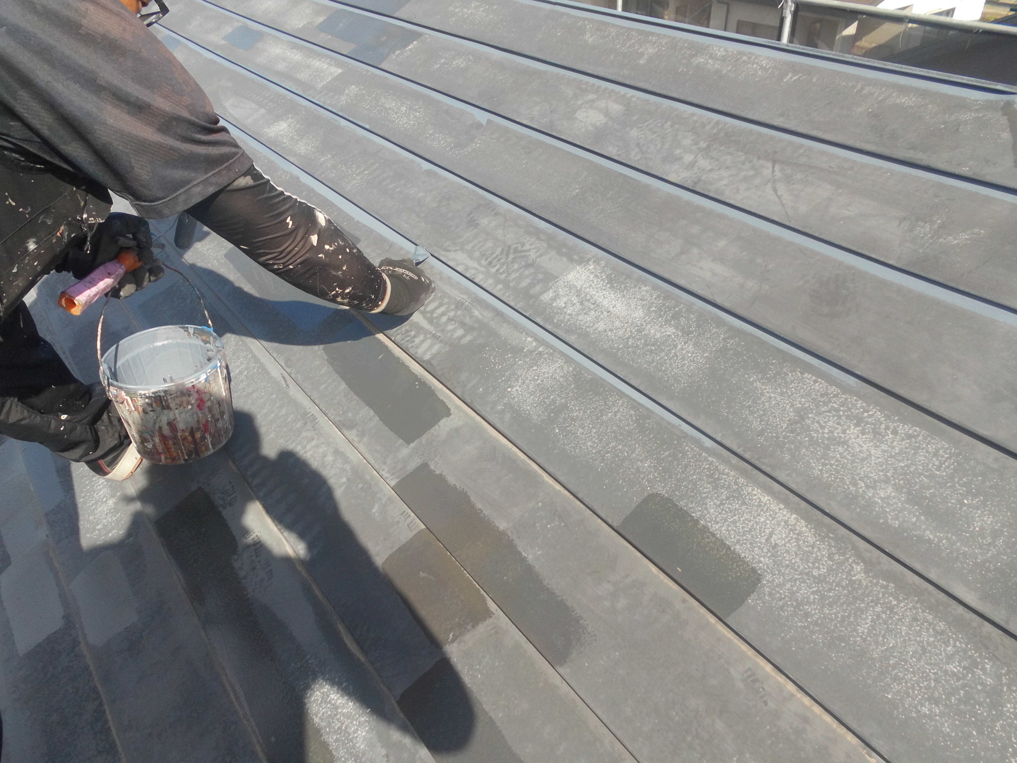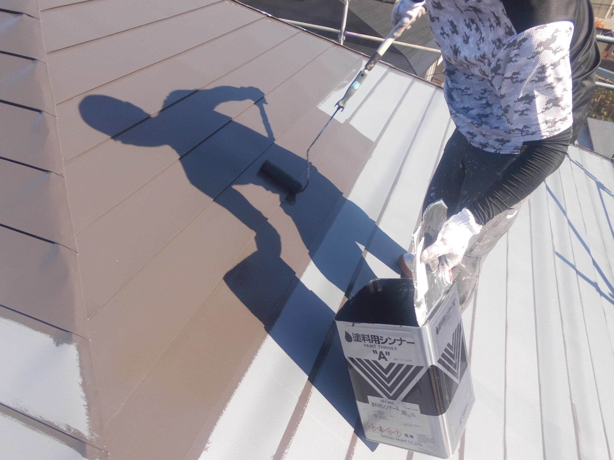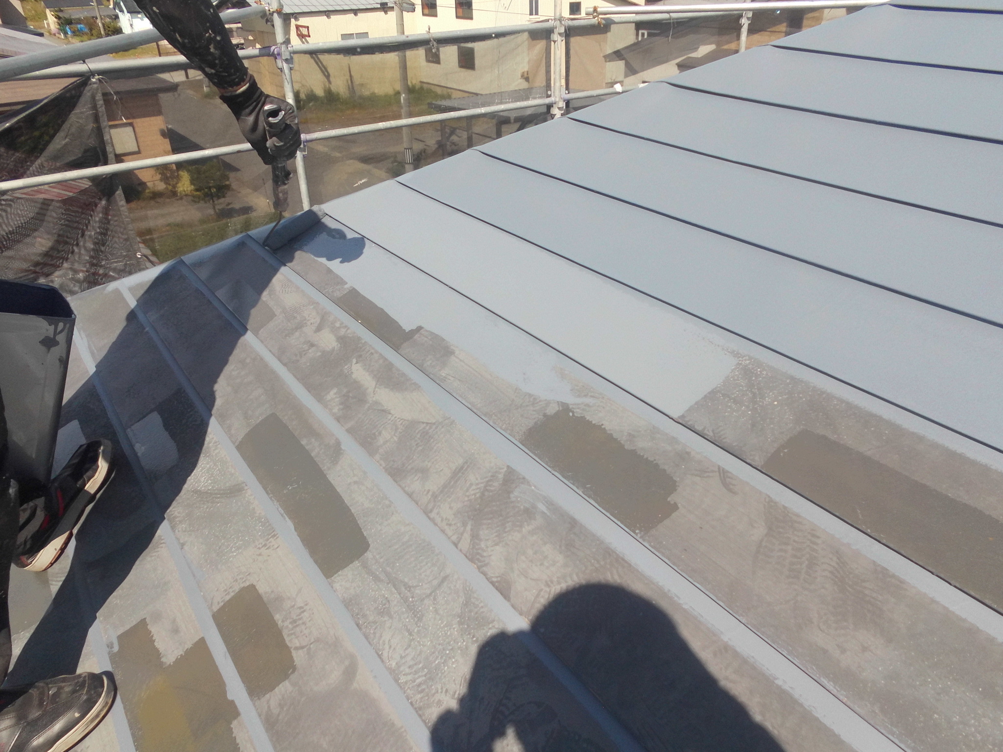 青森県上北郡七戸町での屋根塗替工事で「エポキシ樹脂系錆止め塗料」で下塗施工中です!