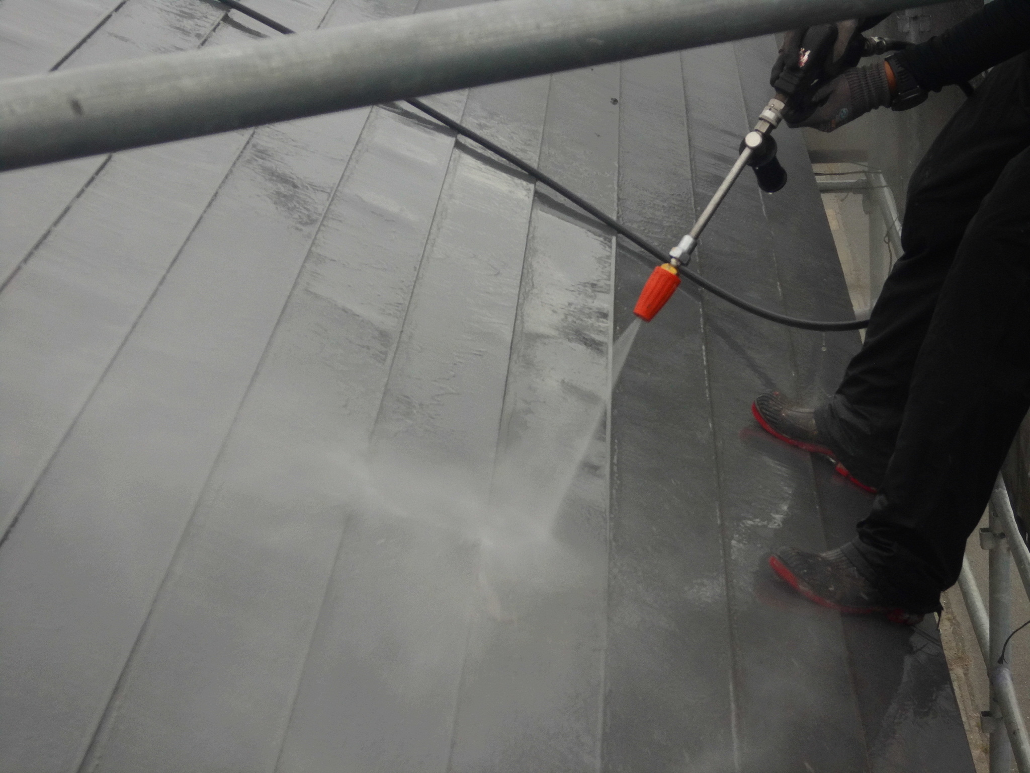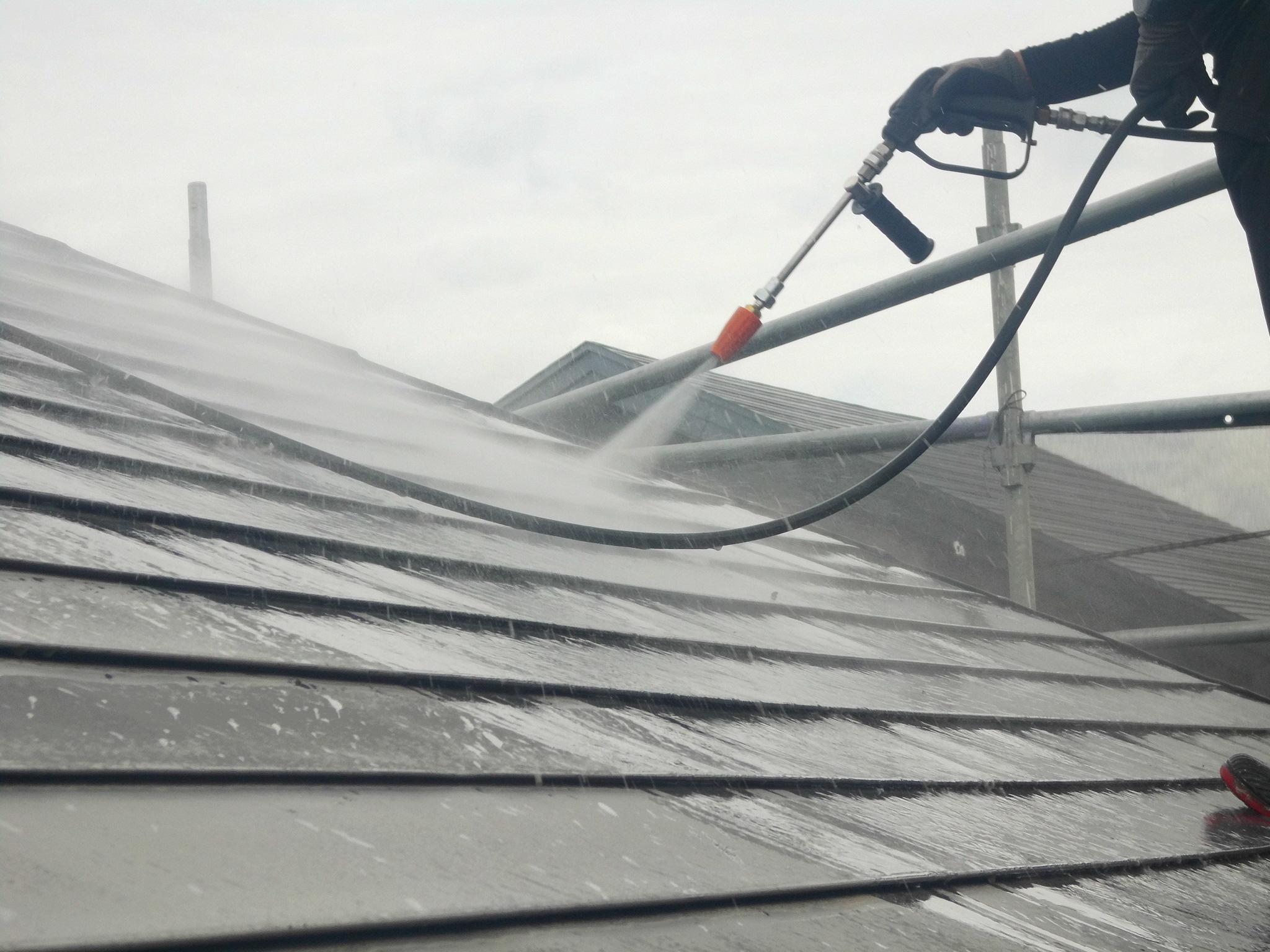 上屋根から小屋根、軒天井と施工する部分をきれいに洗い流していきます。