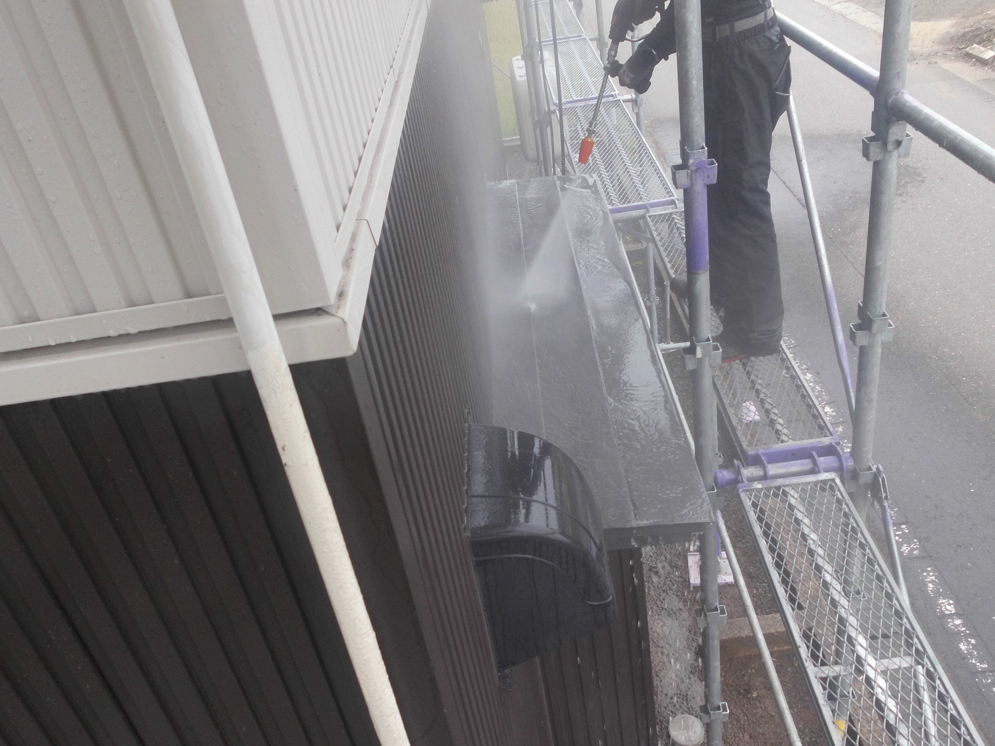 仮設足場設置後、「高圧洗浄」から作業を進めていきます。