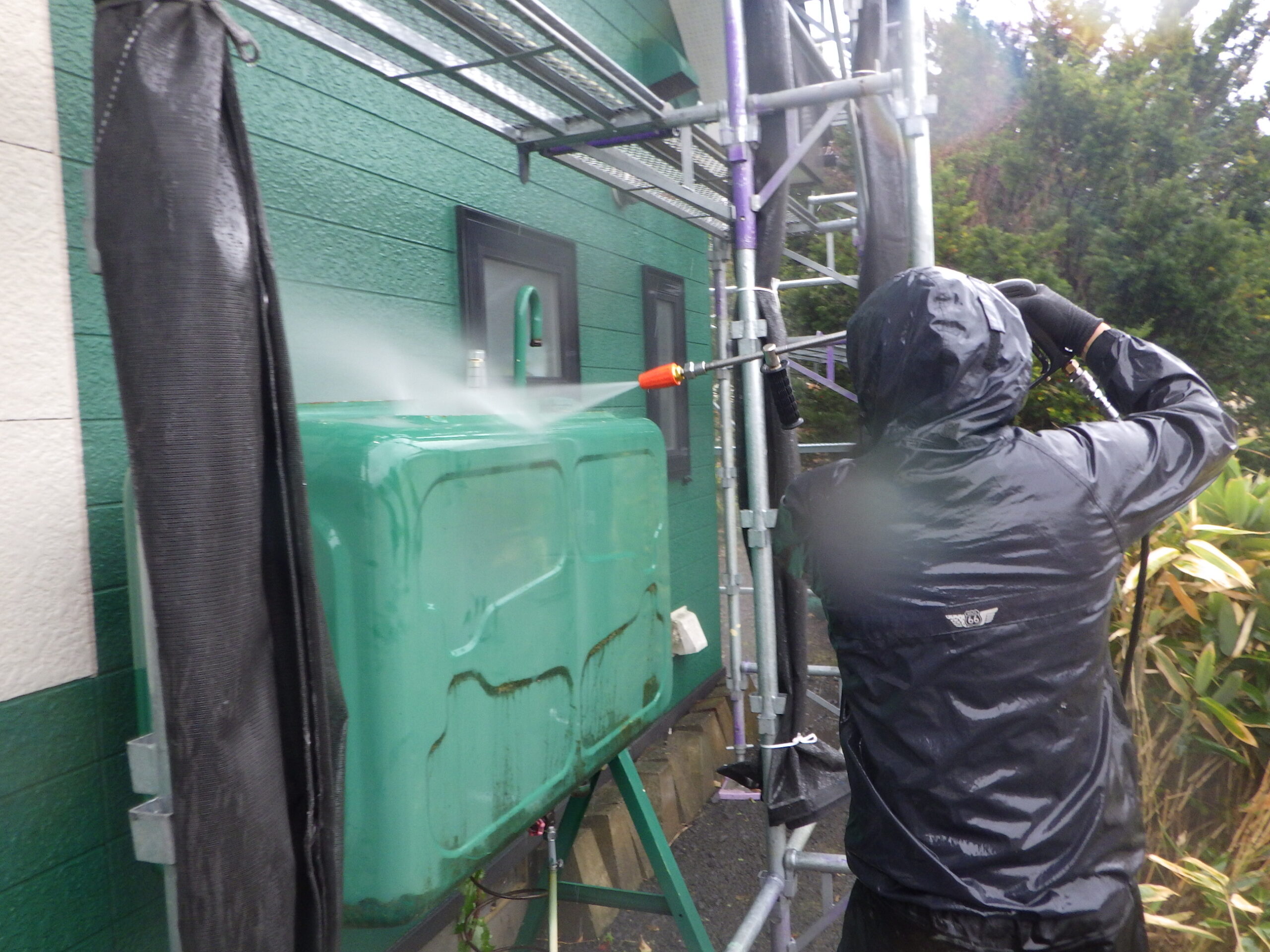 仮設足場設置後、「高圧洗浄」から作業を進めていきます。