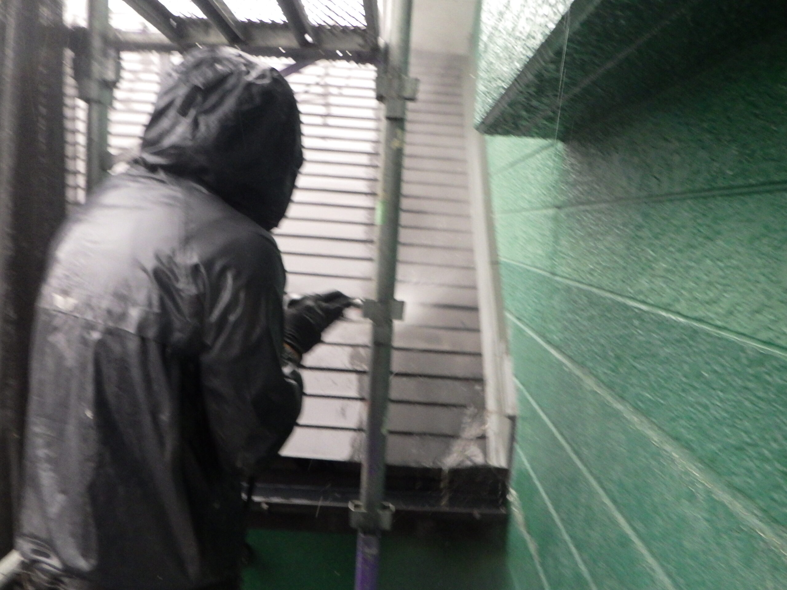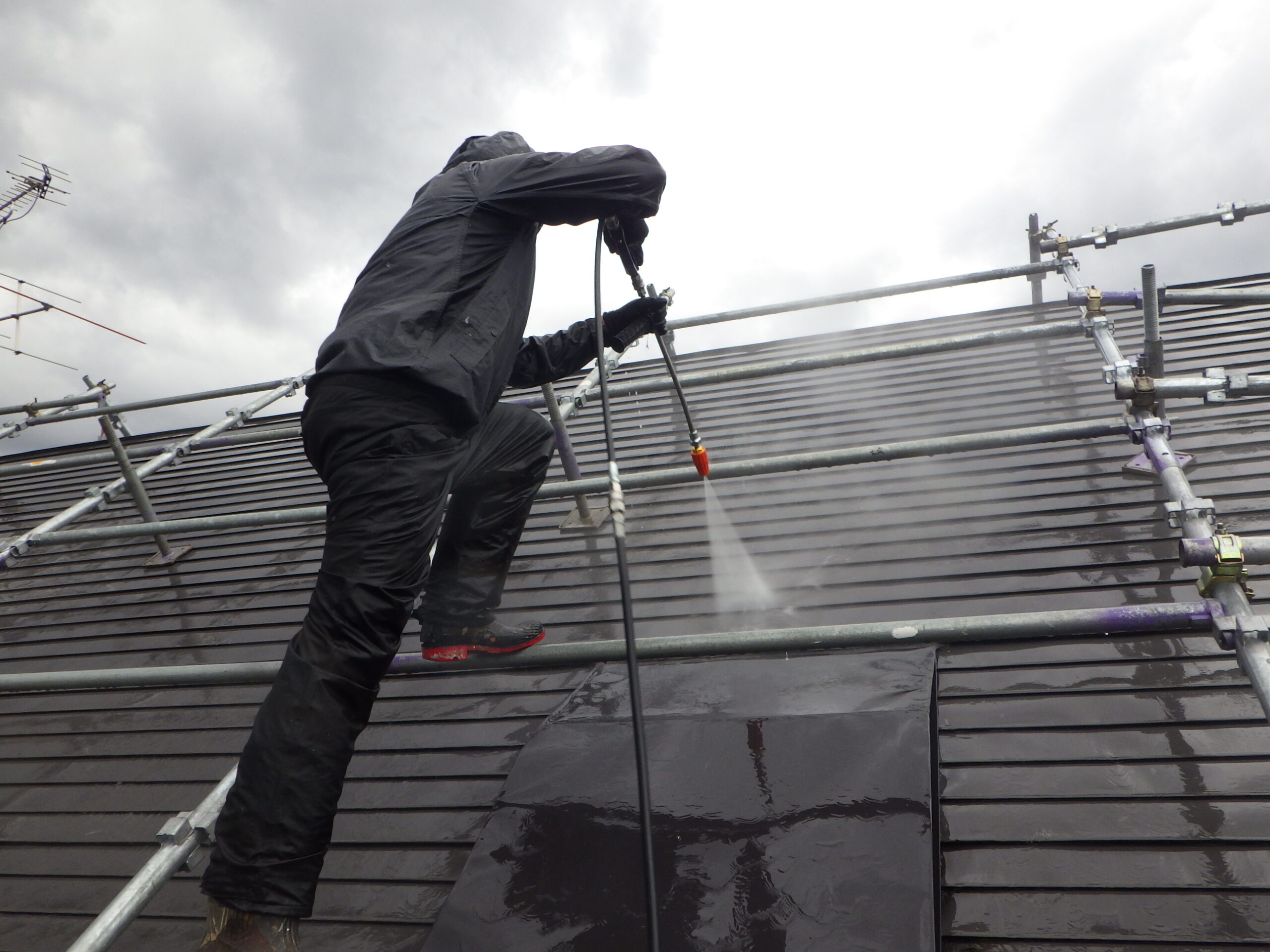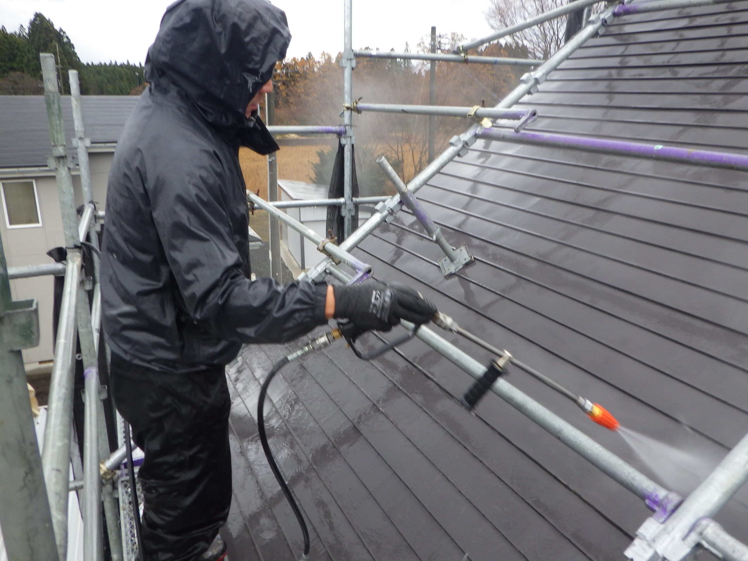 仮設足場設置後、「高圧洗浄」から作業を進めていきます。