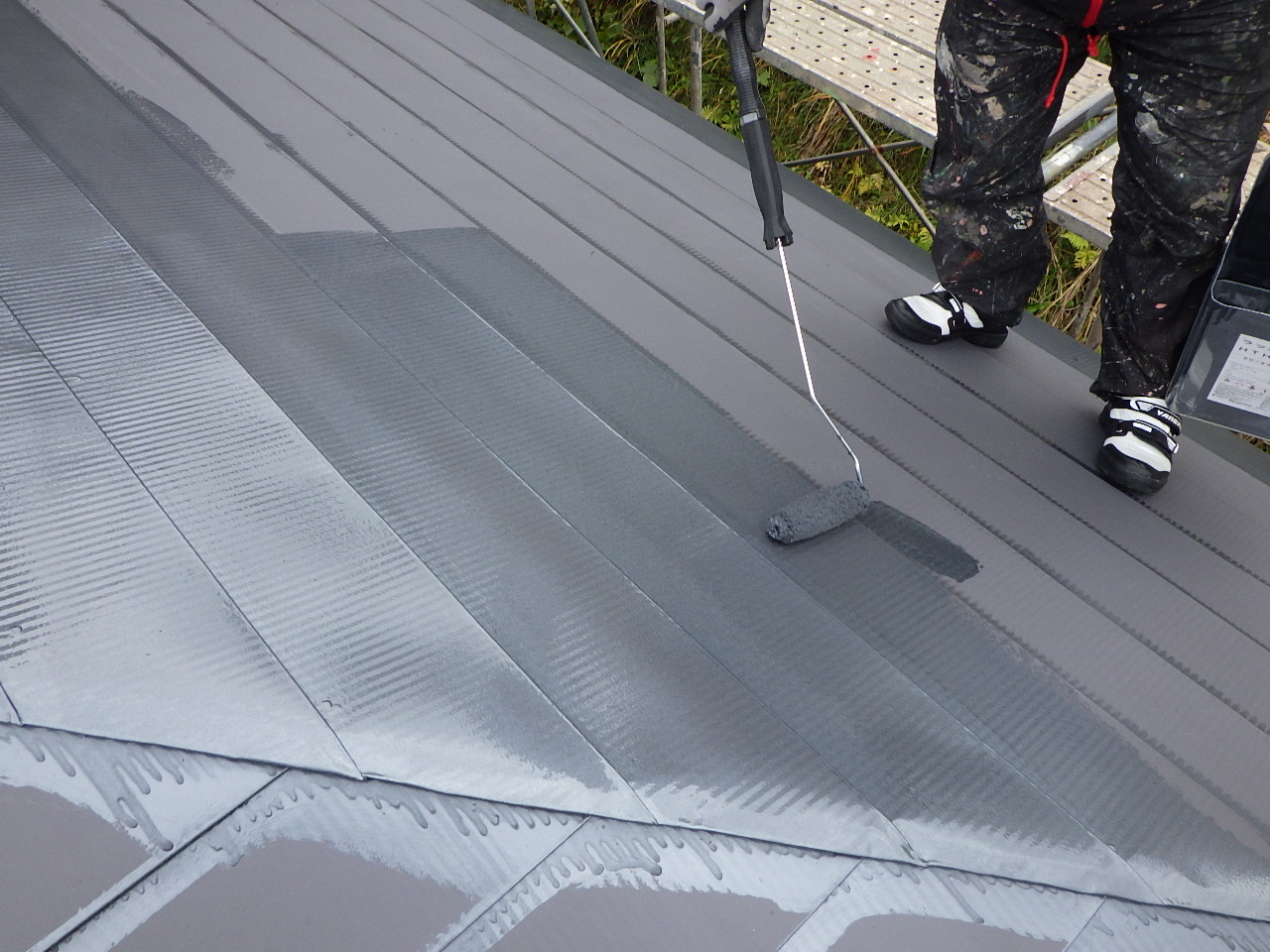 青森県上北郡野辺地町での「全面改装工事」で屋根部の上塗施工中です!
