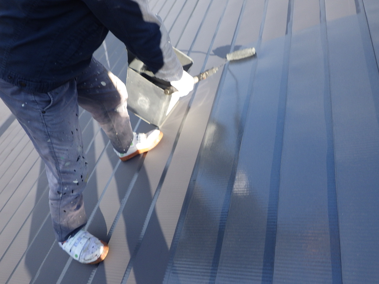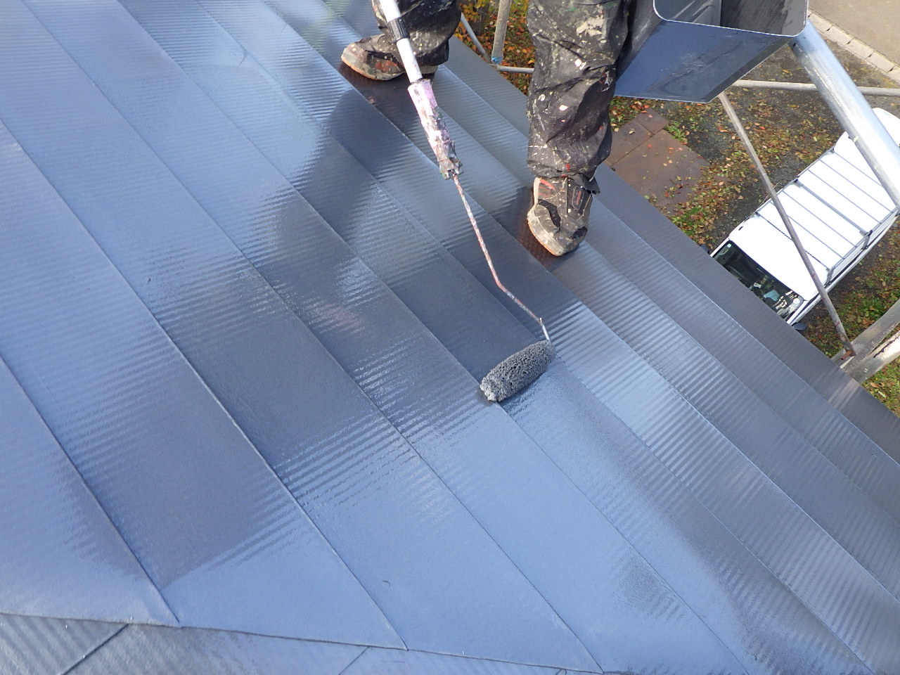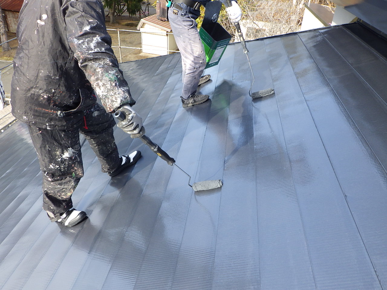 青森県上北郡野辺地町での「全面改装工事」で屋根部の上塗施工中です!