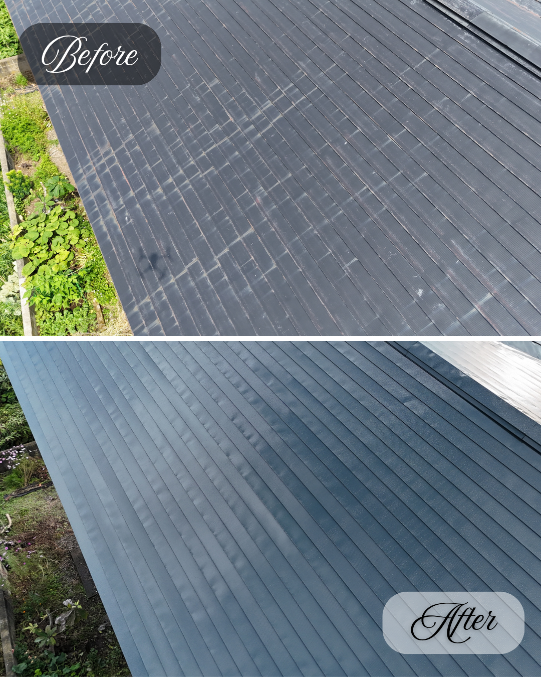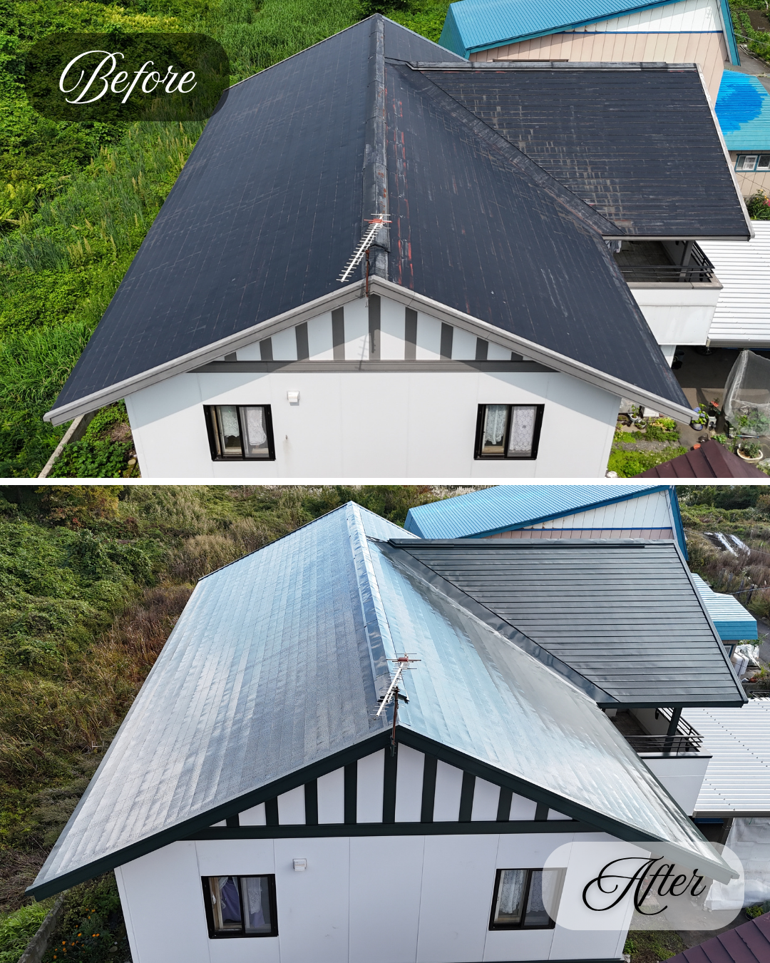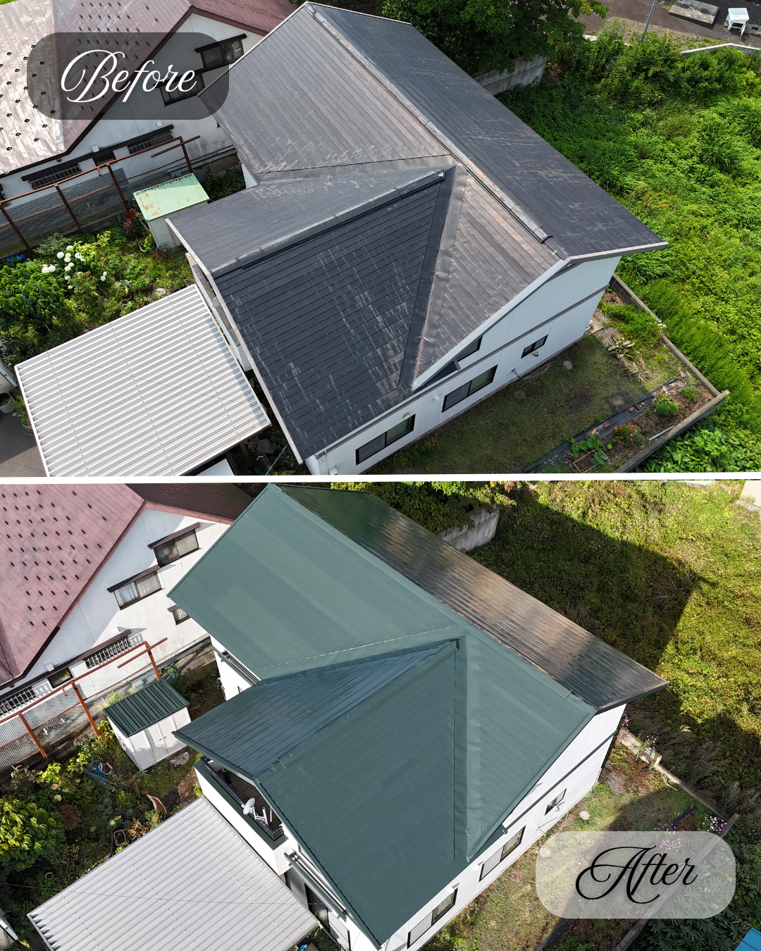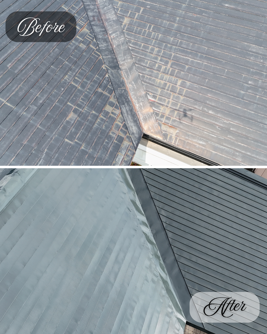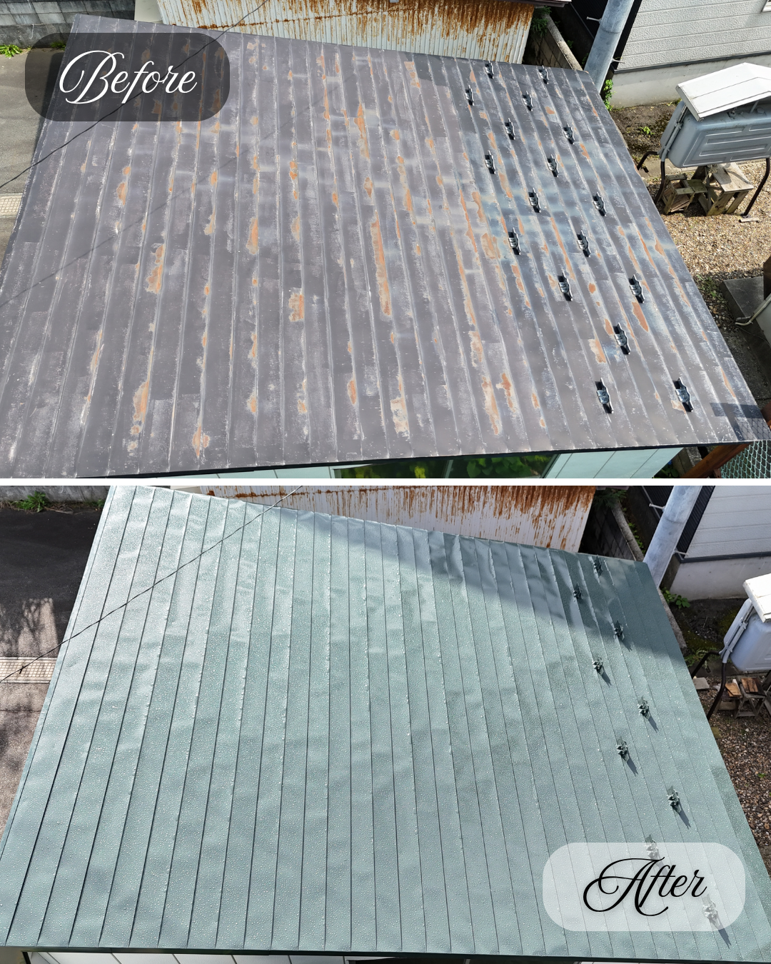 屋根はサビが全体的に発生していましたが、「先行下塗」の施工により長寿命の塗り替え工事を施工する事が出来ました。
