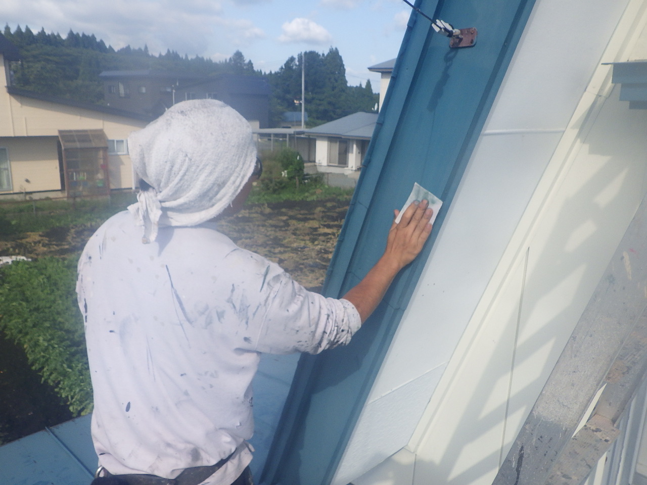 既存塗膜は「目粗し」を行い、錆が発生している部分は「ケレン」作業で下地を形成します。
