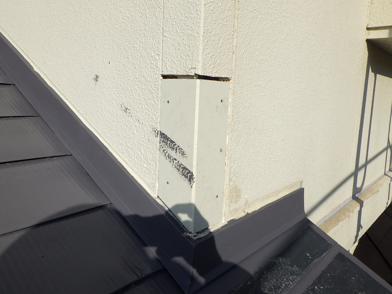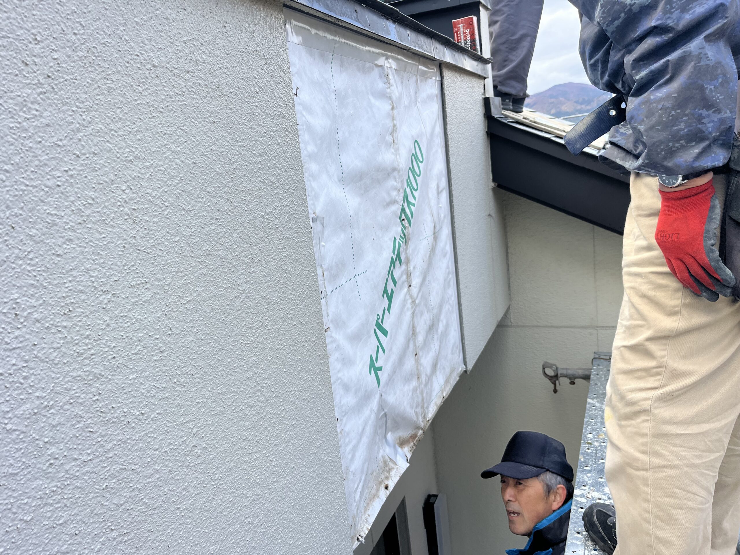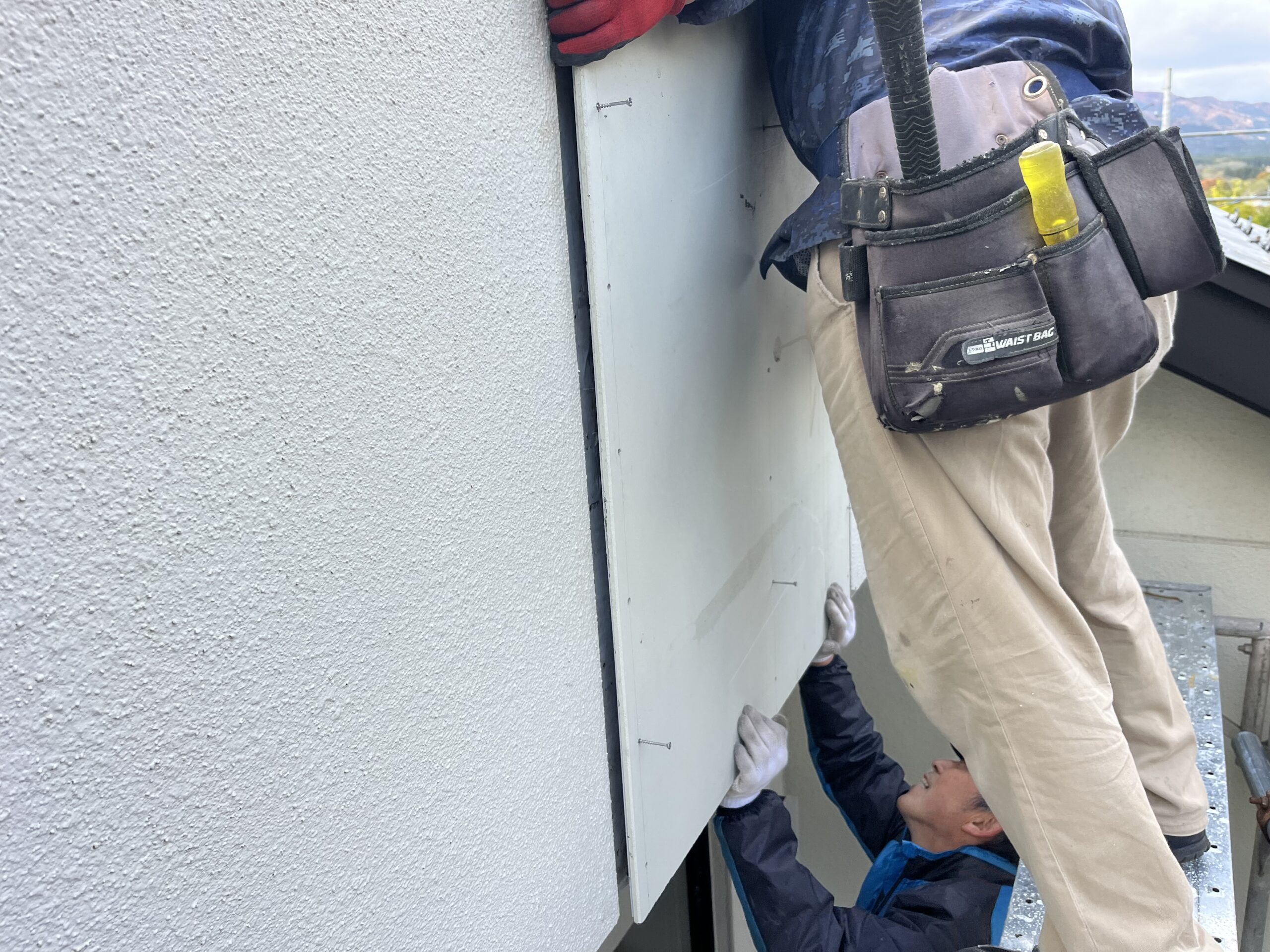 既存の外壁はリシン仕上げの為、無塗装のフラット板を貼ってもらい、塗装工事でパターンを戻して修繕していきます。