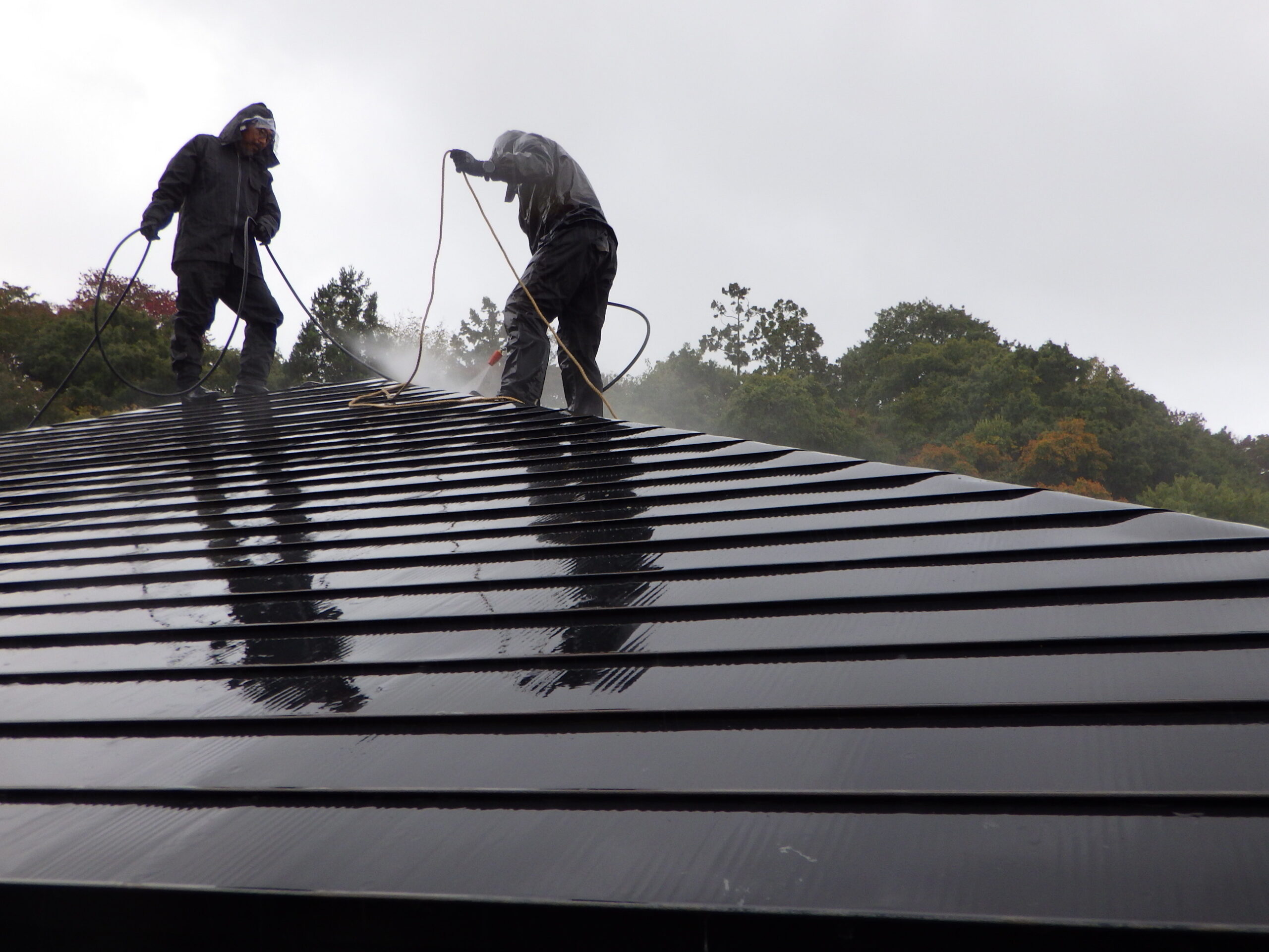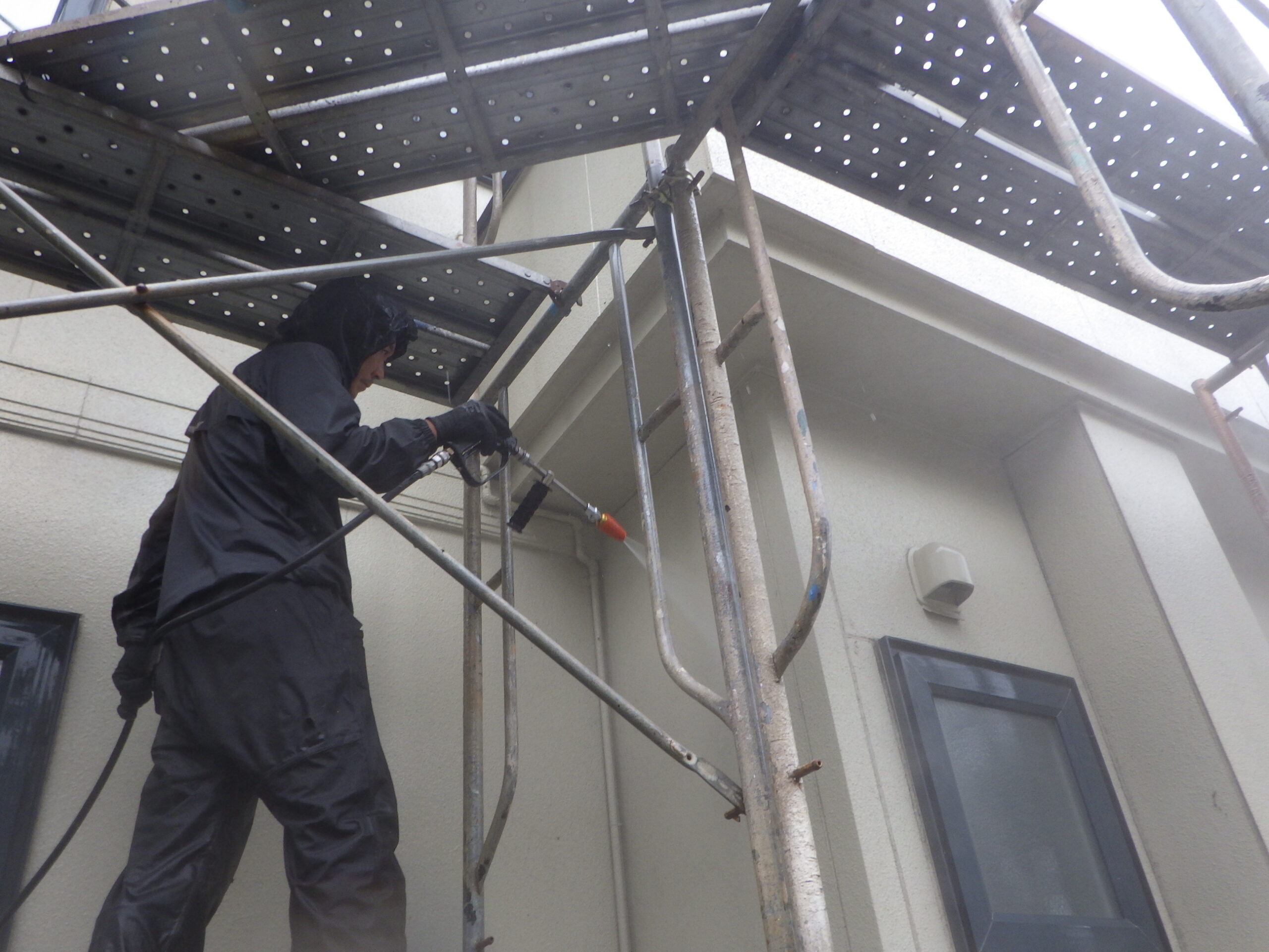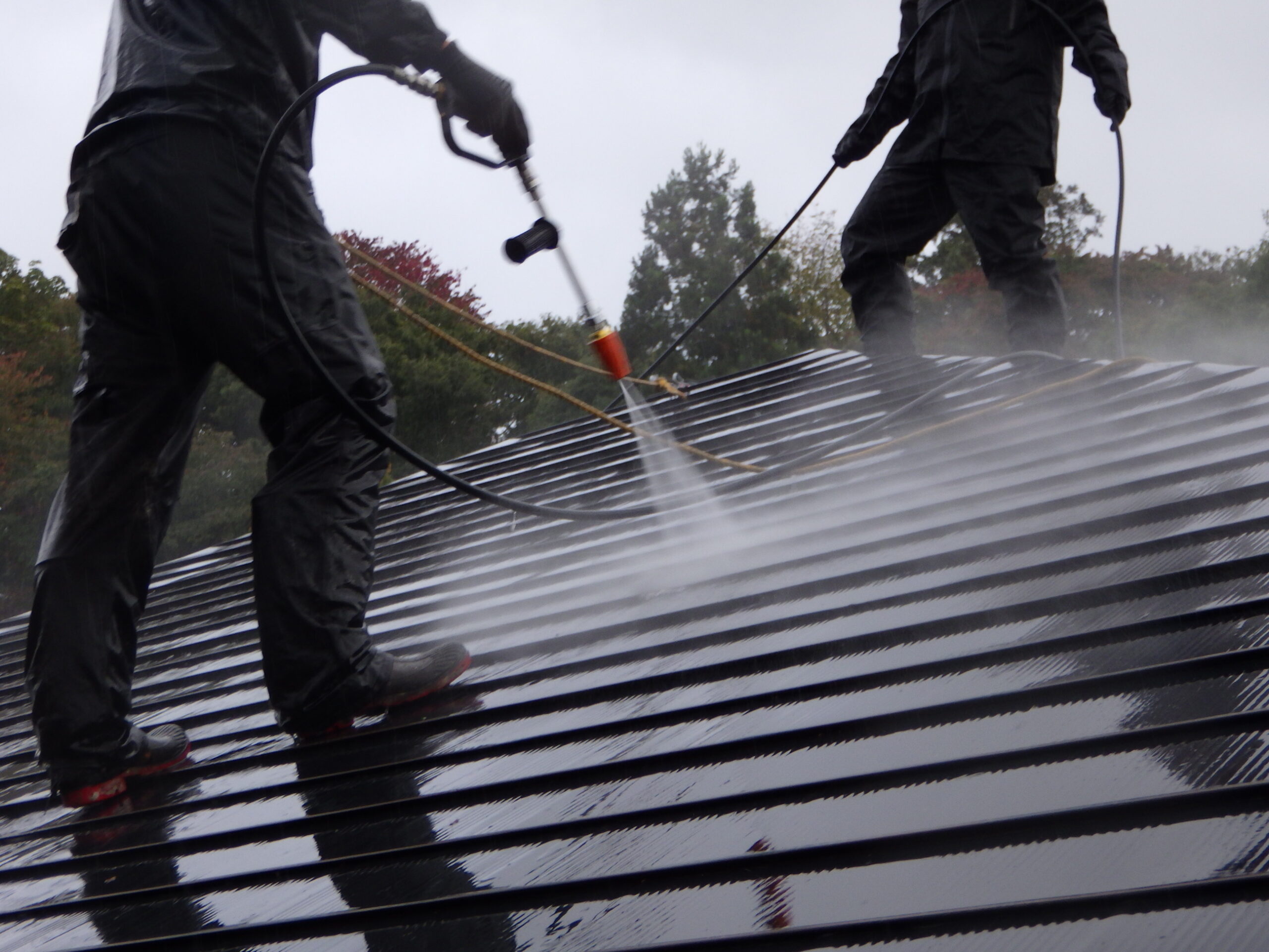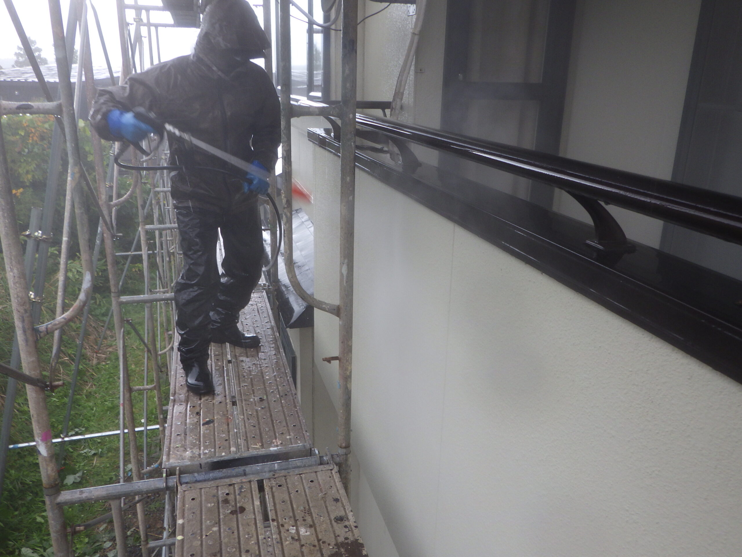高圧洗浄は基本、上から下に降りていきます。(屋根→外壁)