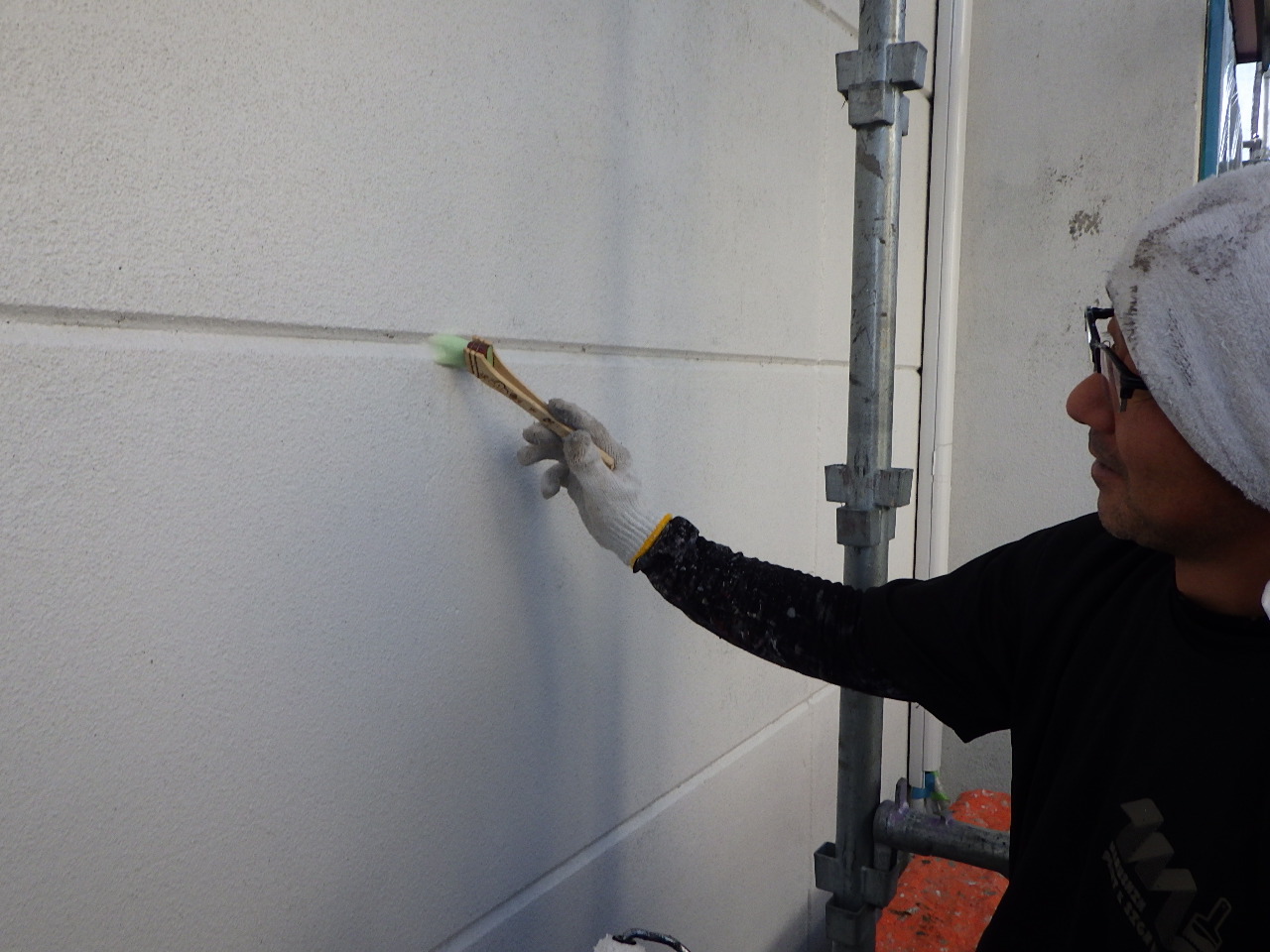マスキングテープで養生してから、プライマーを塗布し『変性シリコン』を新設していきます。